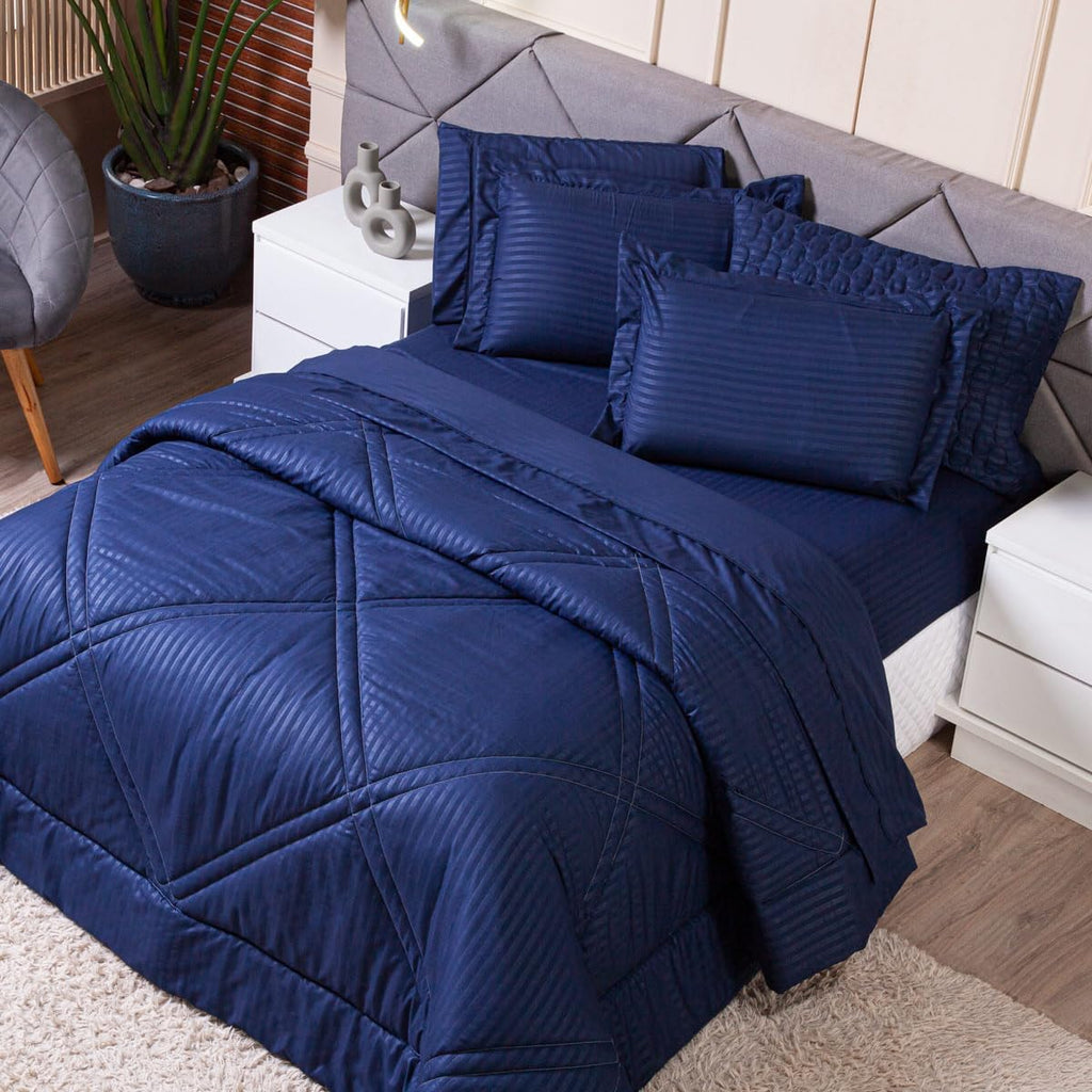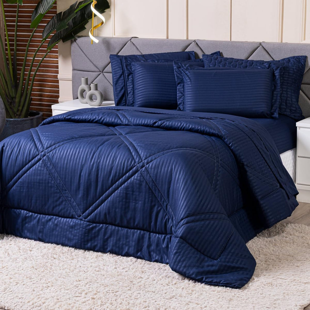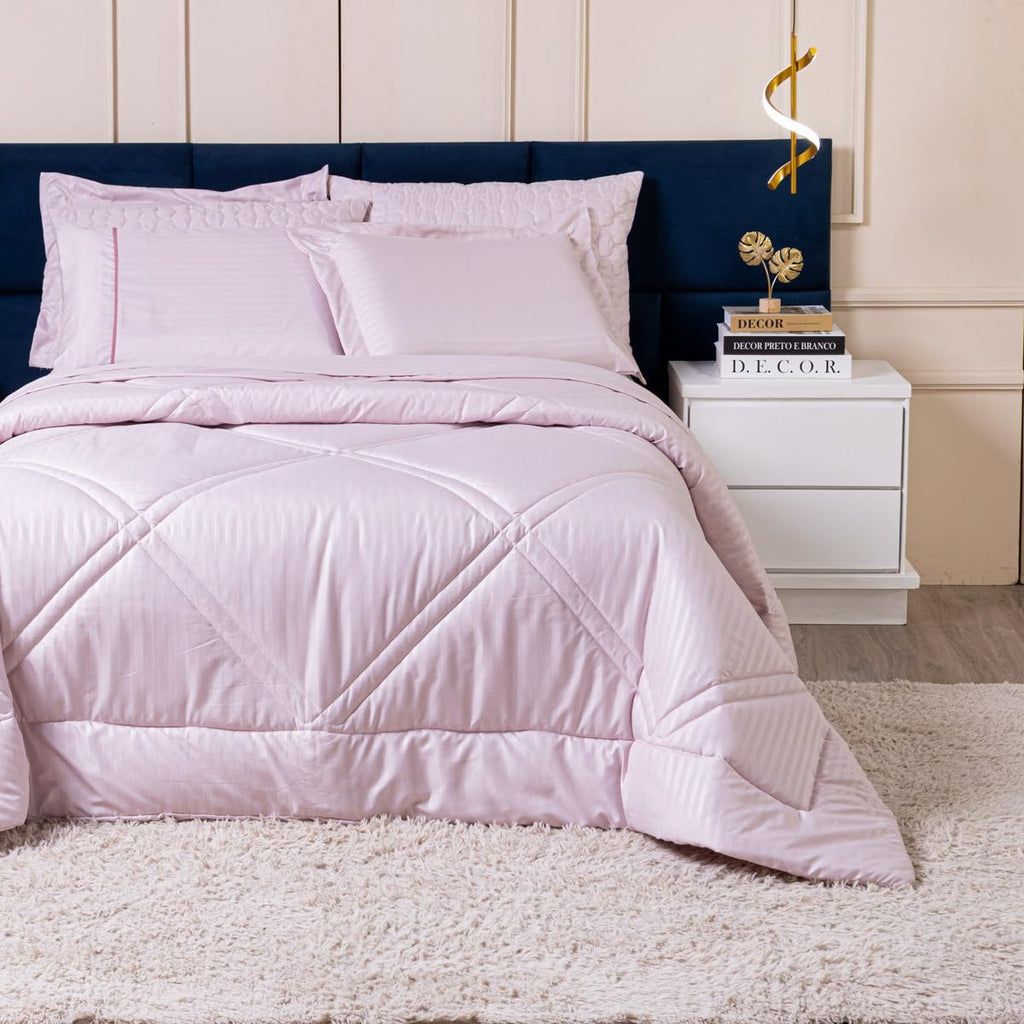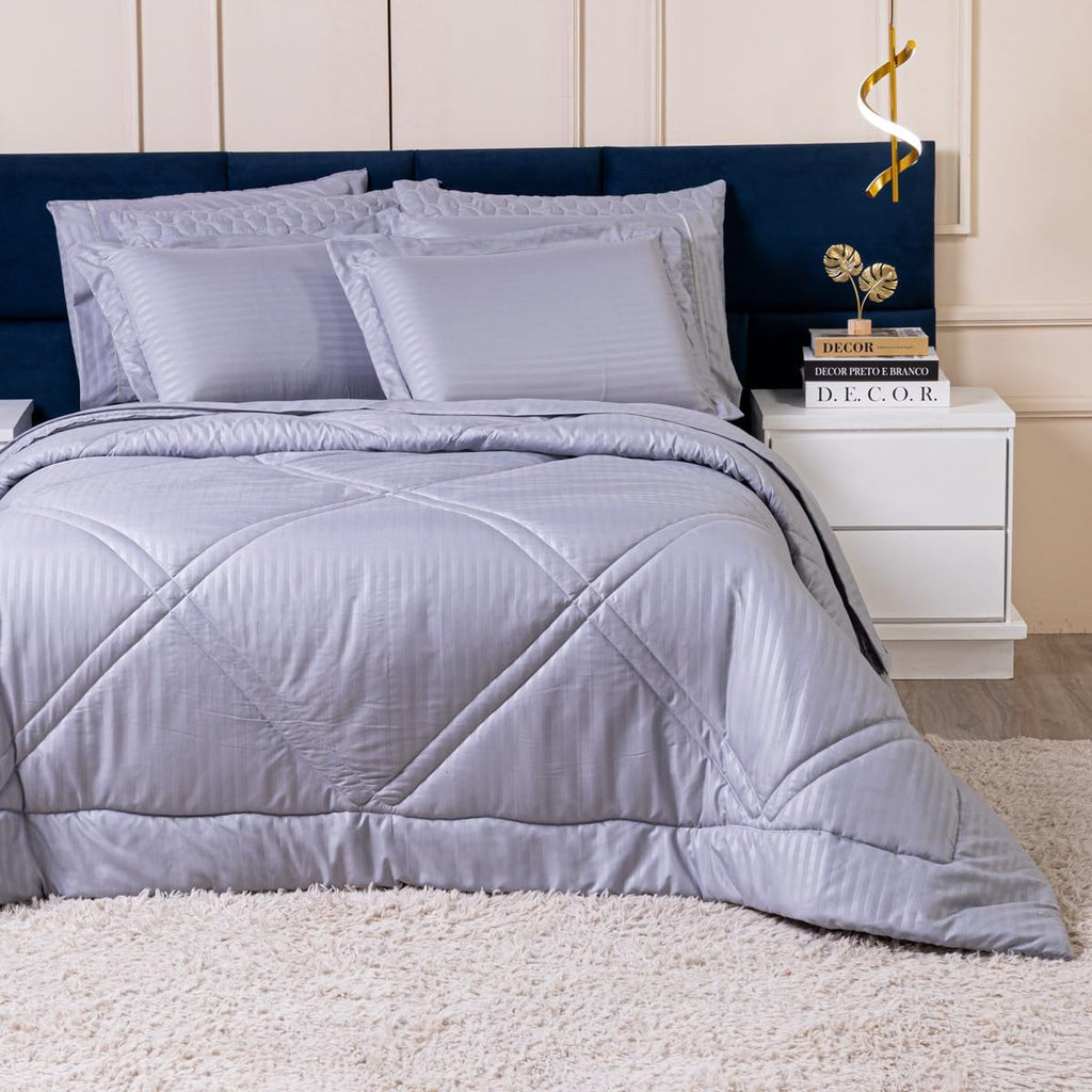 O edredom possui enchimento de manta 150g, proporcionando volume equilibrado e aconchego sem pesar, ideal para uso durante todas as estações. Seu design dupla face em listras, com detalhes em alto relevo, traz versatilidade para mudar o estilo da cama com facilidade — ora mais moderno, ora mais elegante, sempre combinando com diferentes propostas de decoração.