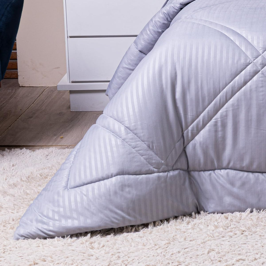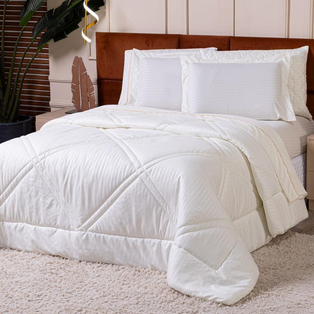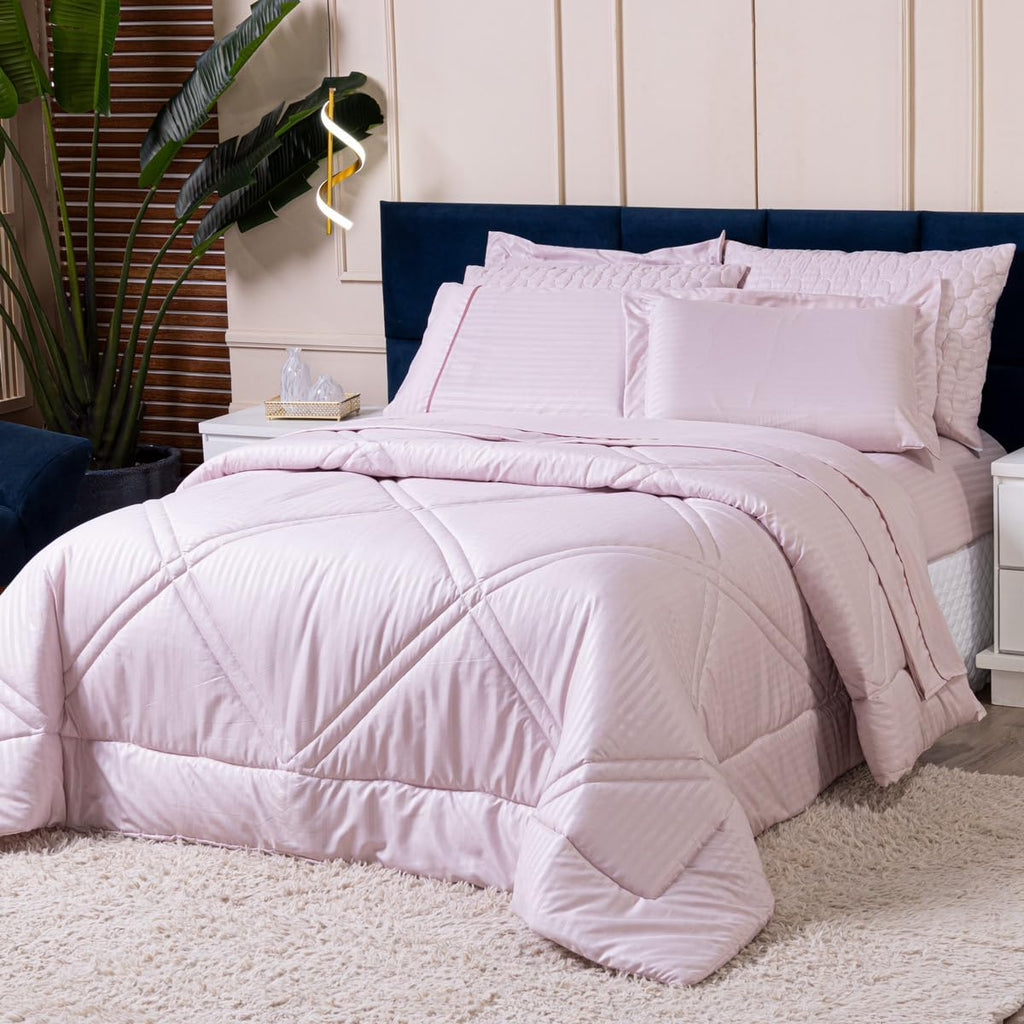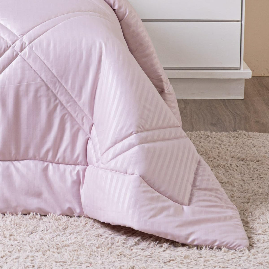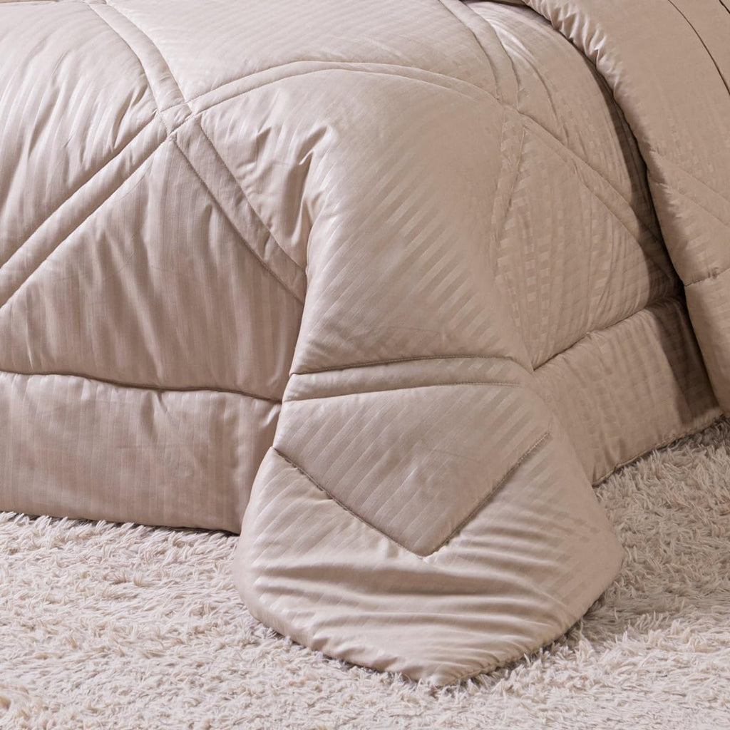 O edredom possui enchimento de manta 150g, proporcionando volume equilibrado e aconchego sem pesar, ideal para uso durante todas as estações. Seu design dupla face em listras, com detalhes em alto relevo, traz versatilidade para mudar o estilo da cama com facilidade — ora mais moderno, ora mais elegante, sempre combinando com diferentes propostas de decoração.
