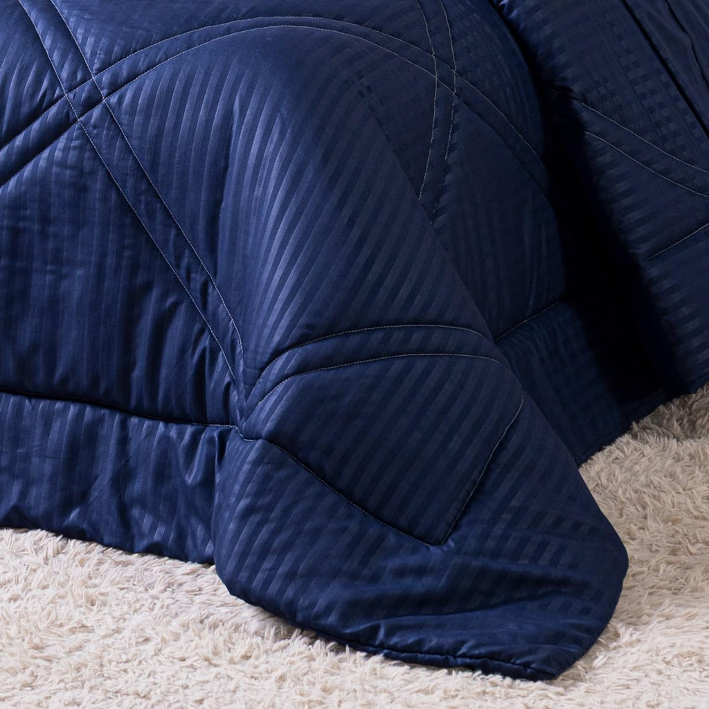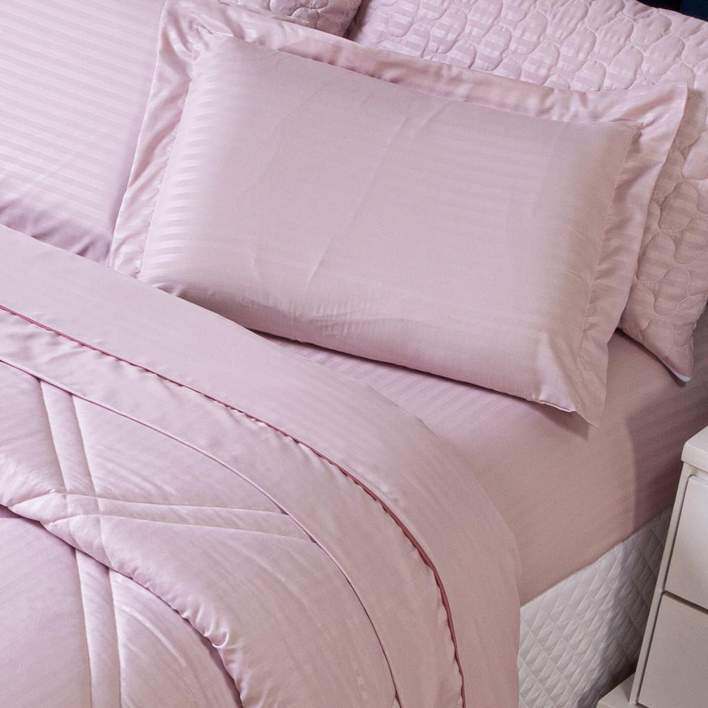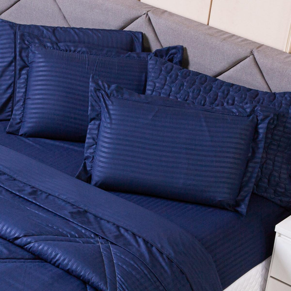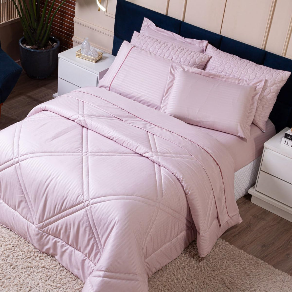 O edredom possui enchimento de manta 150g, proporcionando volume equilibrado e aconchego sem pesar, ideal para uso durante todas as estações. Seu design dupla face em listras, com detalhes em alto relevo, traz versatilidade para mudar o estilo da cama com facilidade — ora mais moderno, ora mais elegante, sempre combinando com diferentes propostas de decoração.