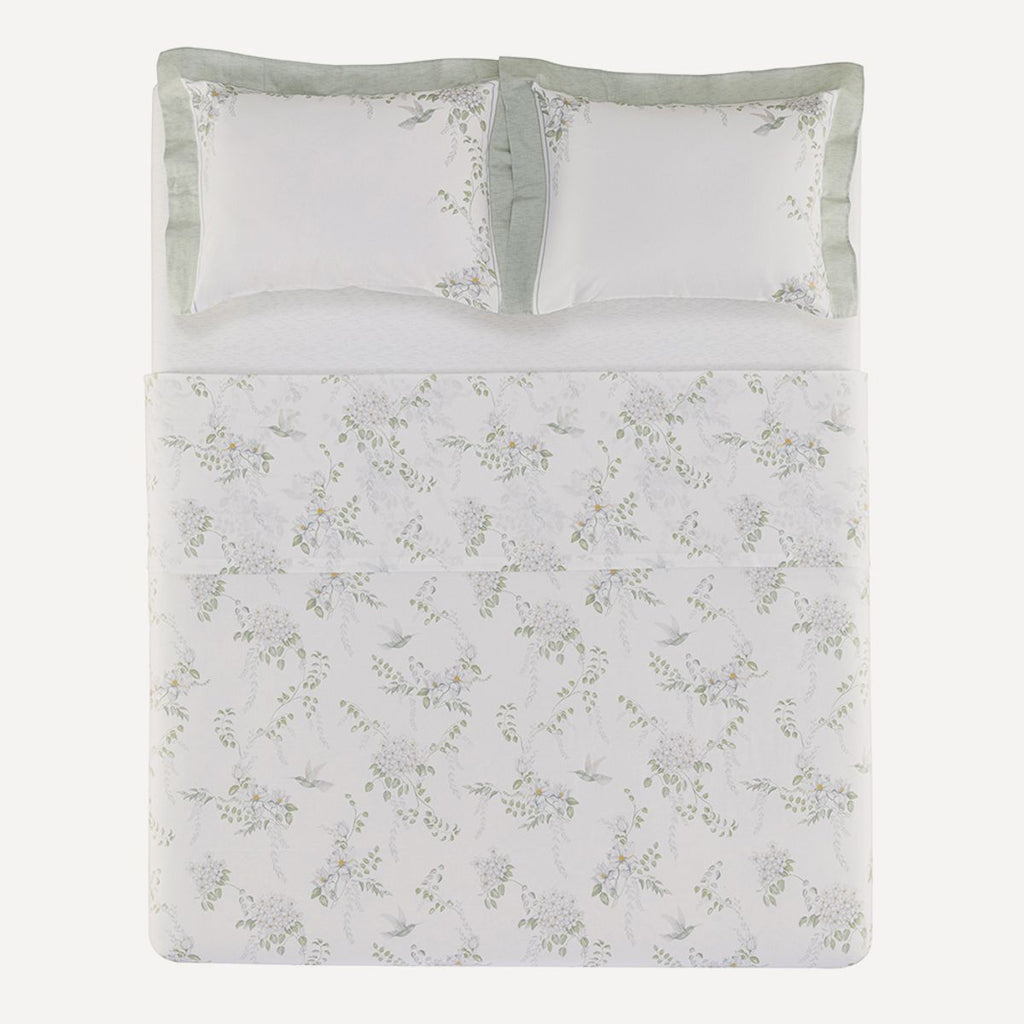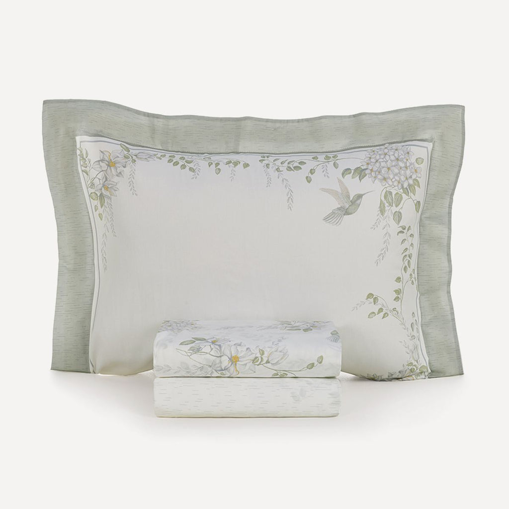 O jogo de cama Laura é um convite à calmaria. Com desenho floral feito à mão e presença do beija-flor na estampa, transmite leveza e serenidade. Os elementos naturais foram retratados com riqueza de detalhes e delicadeza nas formas. O lençol com elástico tem a mesma padronagem das abas das fronhas. Confeccionado em algodão 300 fios, une conforto ao toque e beleza visual. Ideal para quem deseja um quarto com sensibilidade artística e conexão com a natureza em cada detalhe do enxoval.