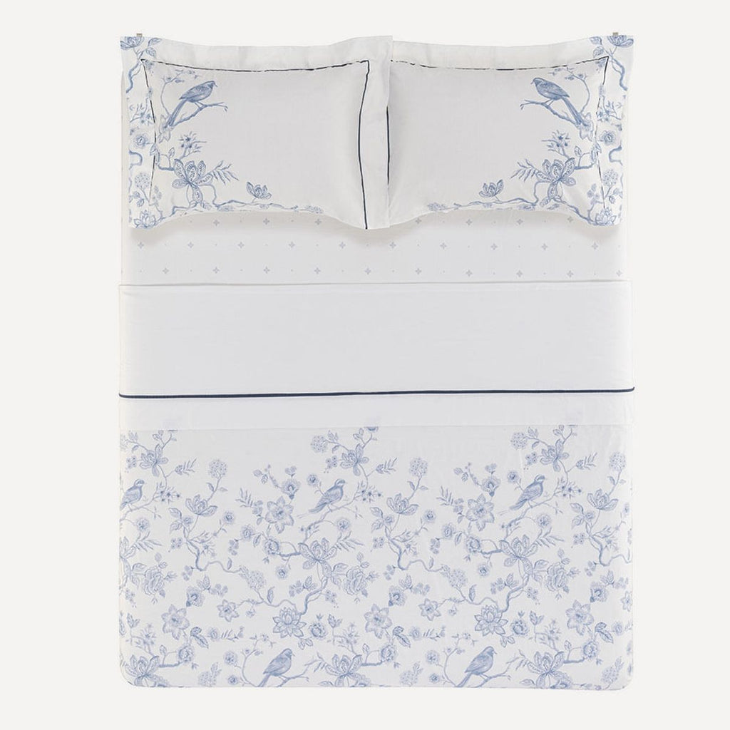 O jogo de cama Dora Queen é sinônimo de sofisticação e conforto, ideal para quem valoriza cada detalhe em sua casa. Confeccionado em 100% algodão e 200 fios, ele oferece um tecido encorpado, altamente respirável, hipoalergênico e resistente a bolinhas, perfeito para proporcionar noites tranquilas. A composição inclui um sobre lençol de medida 2,40m x 2,50m estampado com dobra feita e uma elegante pala de 10cm com filete aplicado na vira; um lençol com elástico 1,58m x 1,98m x 40cm que garante ajuste impecável; fronhas dimensionadas 50cm x 70cm com três abas de 7cm e uma capa de almofada 45cm x 45cm com bordado localizado e cordonê aplicado nos quatro lados. A delicada combinação das cores branco e azul enriquece o visual e está disponível em na colcha e edredom da mesma linha.