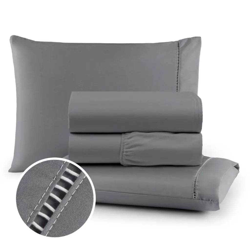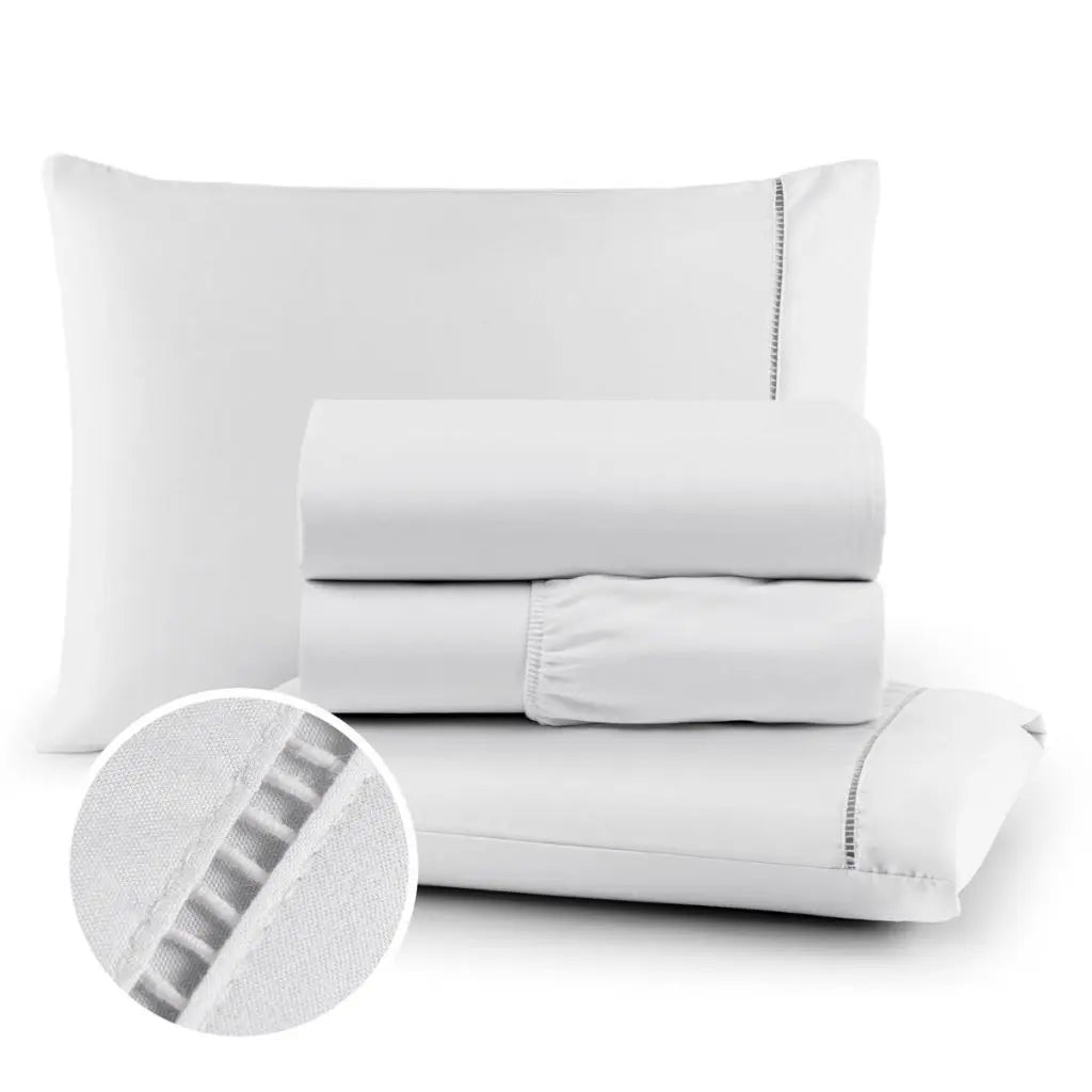 Tamanho King: Contém: 01 Lençol de Cima sem Elástico 2,50m x 2,70m 01 Lençol de Baixo com Elástico 2,03m x 1,93m x 30 cm 02 Fronhas com Ponto Palito 70cm x 50cm