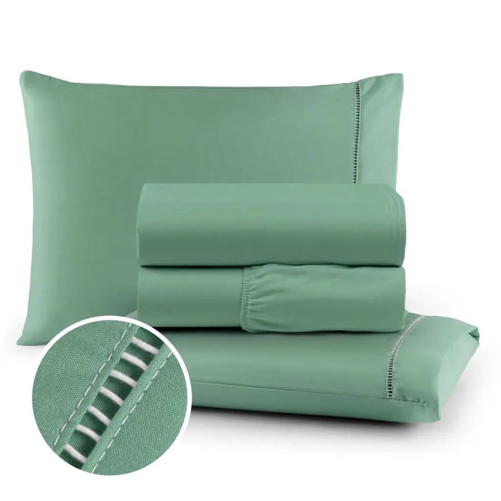 Tamanho Casal: Contém: 01 Lençol de Cima sem Elástico 2,50m x 2,20m 01 Lençol de Baixo com Elástico 1,88m x 1,38m x 30 cm 02 Fronhas com Ponto Palito 70cm x 50cm