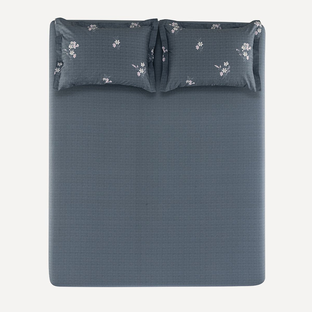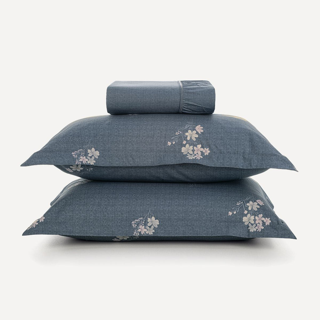 Na versão 3 peças, a cama Helen é 100% estampada, com estampa floral delicada em lilás contrastando com o fundo azul texturizado. As fronhas acompanham a mesma estampa, e o lençol com elástico completa a composição com a textura sutil. Feito em algodão 200 fios, é ideal para quem precisa de praticidade no dia a dia, sem abrir mão do estilo e da beleza na cama posta.